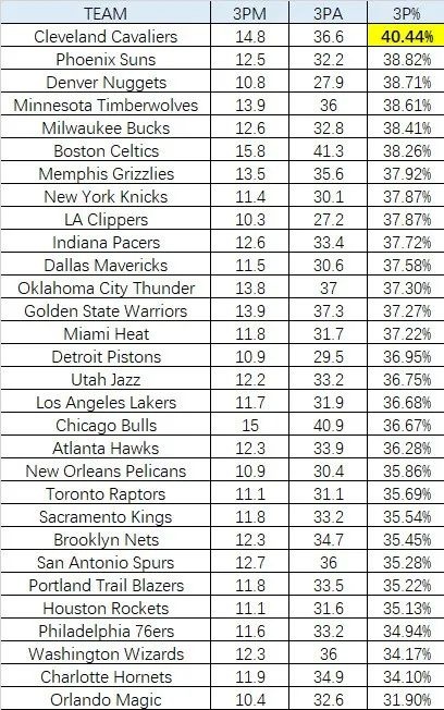 本賽季,防守人距離投籃球員4英尺或以上的空位三分出手中,騎士隊的命中率高達40.4%,全聯(lián)盟斷檔第一。