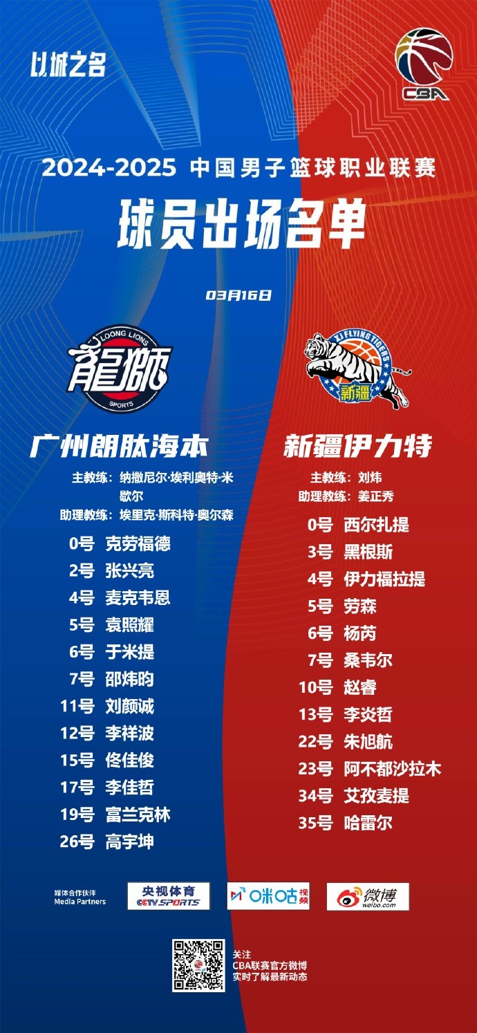 新疆隊VS廣州隊大名單:哈雷爾在列 齊麟缺陣 趙睿&阿不都領(lǐng)銜