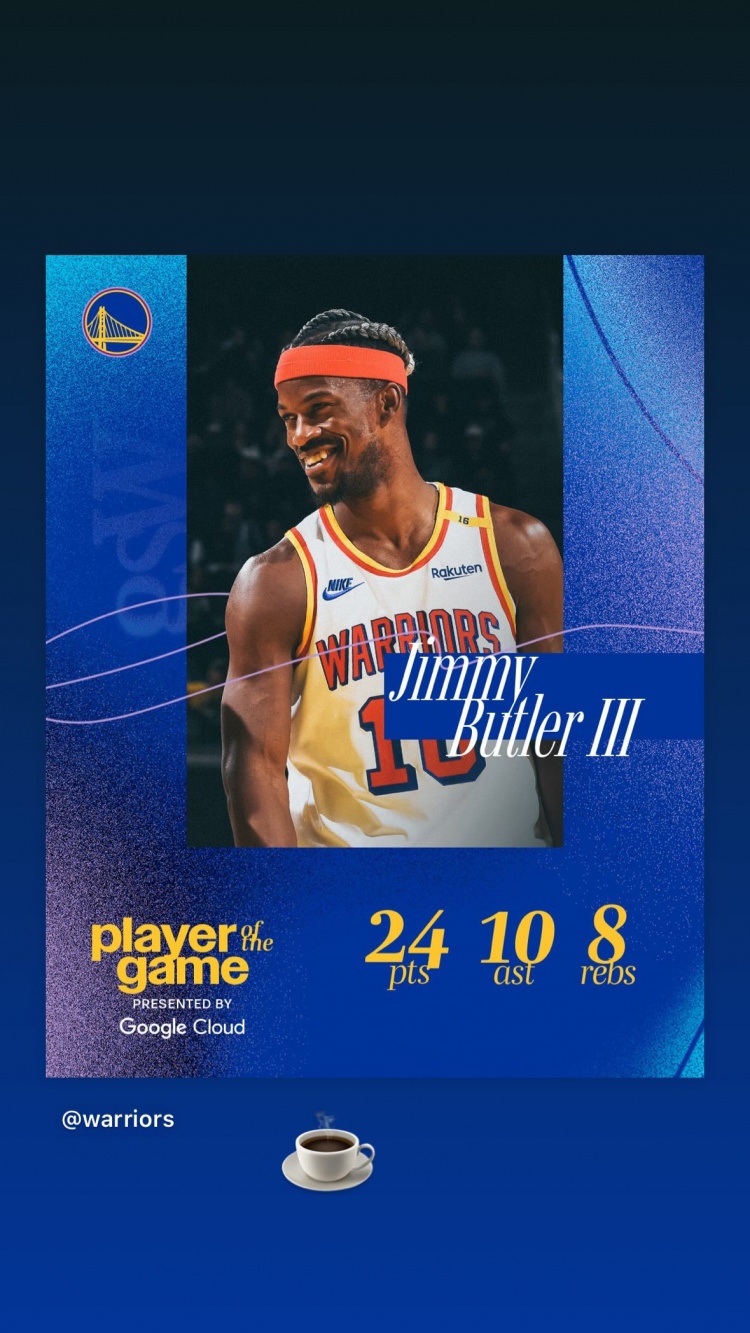 賽后,勇士官方評選巴特勒為本場最佳球員。庫里轉發(fā)并配上咖啡表情“??”