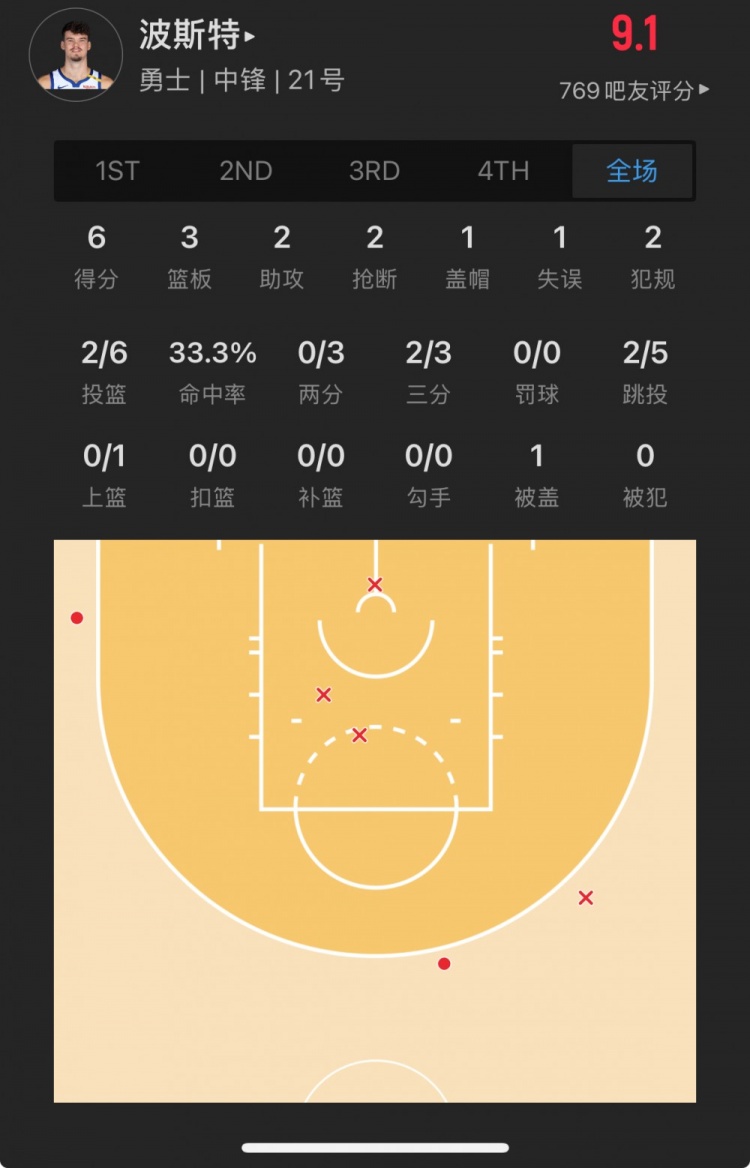 勇士52號(hào)秀 昆滕-波斯特 登場(chǎng)17.1分鐘