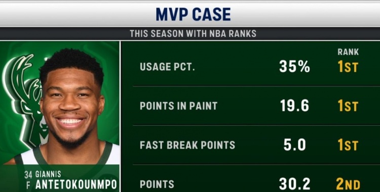 比賽開始前,電視轉播商列舉了字母哥競爭本賽季MVP的優(yōu)勢,賽季至今,字母哥的使用率35%,聯盟第1,場均禁區(qū)得分19.6分,聯盟第1,場均快攻得分5分,聯盟第1,場均30.2分,聯盟第2。
