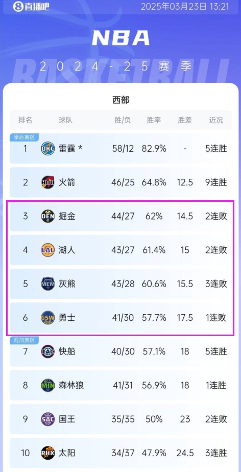 西部第3的掘金、第4的湖人、第5的灰熊和第6的勇士最近都在輸球;第7的快船打出5連勝,森林狼位居第8,兩隊(duì)都和第6的勇士(季后賽直通區(qū))只差0.5個(gè)勝場(chǎng);第2的火箭豪取一波9連勝穩(wěn)住目前的排位;雷霆此前已經(jīng)鎖定西部第一的位置。