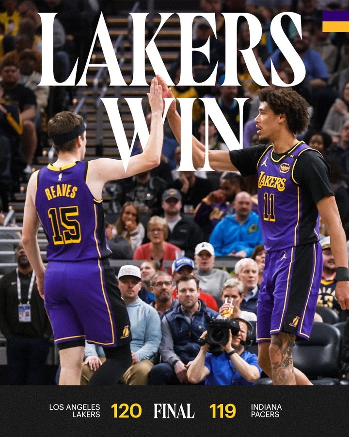 賽后湖人官方曬出贏球海報(bào),里夫斯和海斯擊掌的畫(huà)面登上封面。