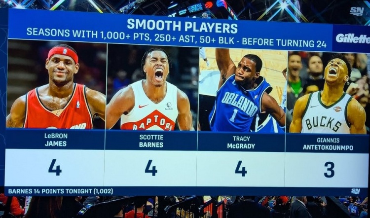 根據(jù)數(shù)據(jù)統(tǒng)計,加上本場比賽,斯科蒂-巴恩斯本賽季的得分已經(jīng)突破1000分。生涯至今他已經(jīng)4次做到單賽季得分1000+助攻250+蓋帽50+,他追平詹姆斯和麥迪,成為25歲前單賽季得分1000+助攻250+蓋帽50+次數(shù)最多的球員。