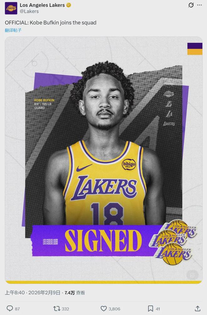 - 湖人與科比·巴夫金簽約,巴夫金:最愛科比,穿紫金戰(zhàn)袍很酷