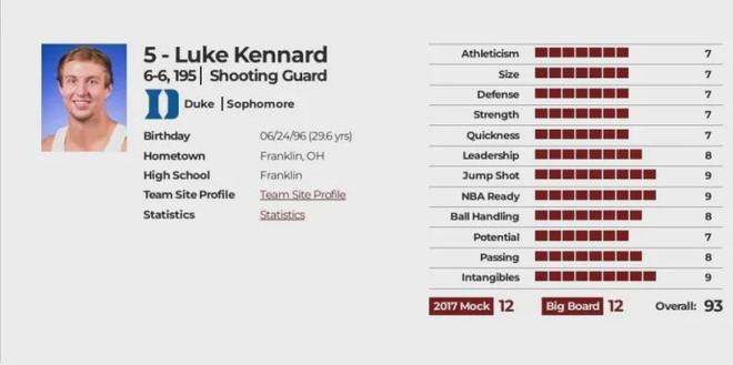 NBA選秀網(wǎng)站綜合評(píng)分93分,預(yù)計(jì)選秀順位12順位,實(shí)際選秀順位12順位,選秀模板:尼克-斯陶斯卡斯/杰夫-霍納塞克.