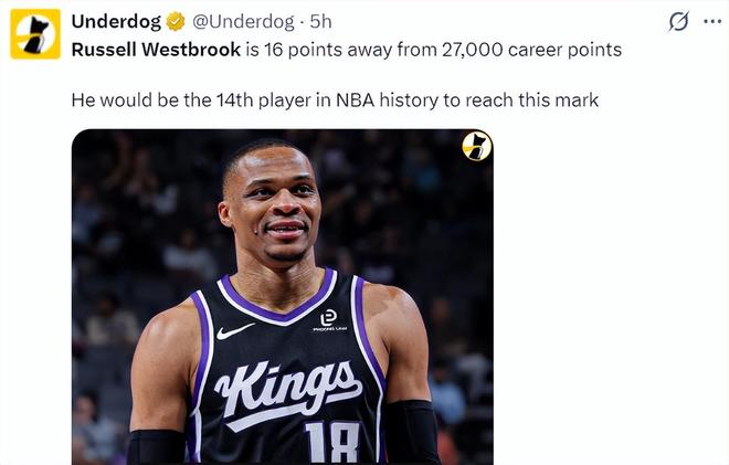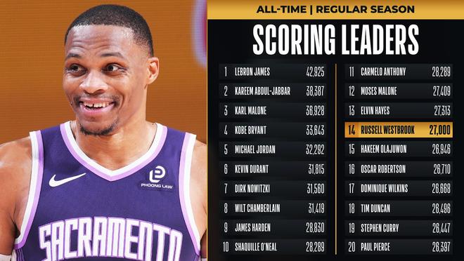 37歲的威少在NBA已經(jīng)打了18個賽季,他終于拿到了27000分,也是NBA歷史上第14位達成2.7萬分的球員。