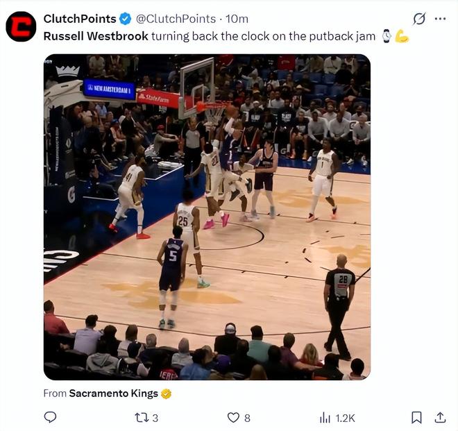 37歲的威少競技狀態(tài)依舊非常出色,在隊友上籃不中后,37歲的威少從后方殺出直接高高躍起完成了補扣,這個補扣還隔著一個防守球員,這就是昔日常規(guī)賽MVP的硬實力,威少就是NBA歷史上球風(fēng)最勁爆的控球后衛(wèi)。