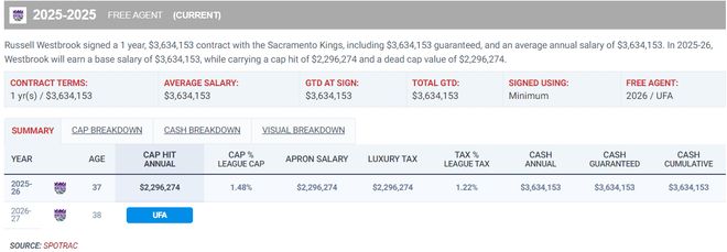 很難想象這支國王隊唯一能讓球迷駐足的球員會是37歲的威少,這是一個已經(jīng)拿了4年低廉薪水的老將,2022年784萬、2023年383萬、2024年560萬、2025年330萬、2026年363萬。