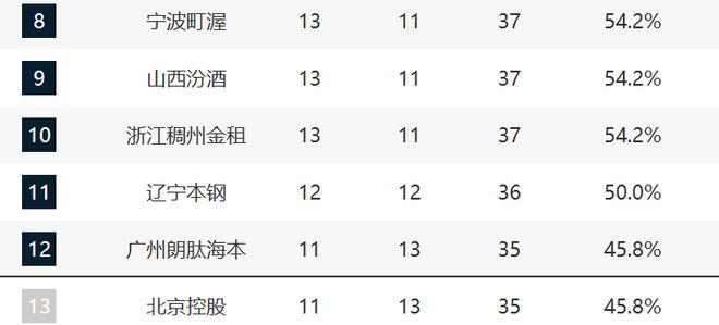 8-13分別是寧波、山西、浙江、遼寧、廣州和北控。寧波、山西和遼寧最近的趨勢非常好,他們都保持了連勝。特別是遼寧,第一階段迷失后現(xiàn)在已經三連勝,隨著小外補強,有望迎來崛起。只是這輪浙江輸給了天津,這應該算是冷門了,球員和教練組的問題都非常大。廣州則被寧波給絕殺了,甚至現(xiàn)在郭艾倫還賽季報銷,對于球隊不是好的消息。北控則輸給了上海,實力差距大也沒有辦法。