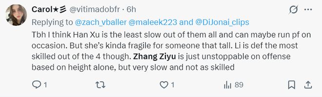 美球迷:韓旭是中國隊內(nèi)線中速度最快的,但她的身體對抗不行;李月汝是四大中鋒中技術(shù)最全面的,張子宇就憑身高優(yōu)勢在內(nèi)線就不可阻擋,但他速度很慢,技術(shù)也不如其余三人還需要提升。