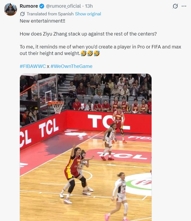 外媒記者:張子宇在中鋒位置是什么樣的存在?這讓我想起了在FIFA游戲中創(chuàng)建角色時,將球員身高、體重設(shè)置到最大值的情景。