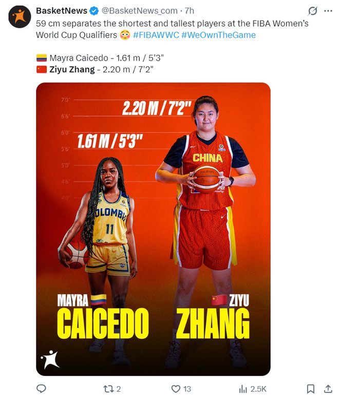 本屆世預賽張子宇7尺2(2.2米)賽事第一,而委內(nèi)瑞拉的卡伊賽多5尺3(1.61米)是賽會最矮。