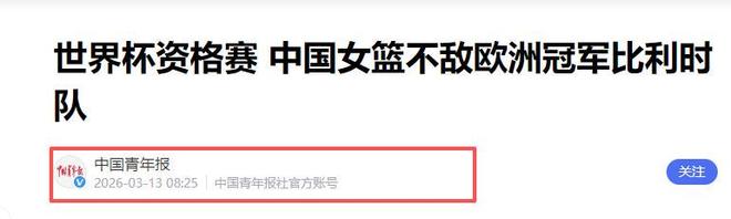 中國青年報(bào)2026-03-13《世界杯資格賽 中國女籃不敵歐洲冠軍比利時(shí)隊(duì)》