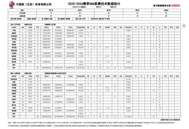 - 2026年03月13日 遼寧逆轉勝山西 李曉旭11+6 趙繼偉9+5+3斷 迪亞洛25+10