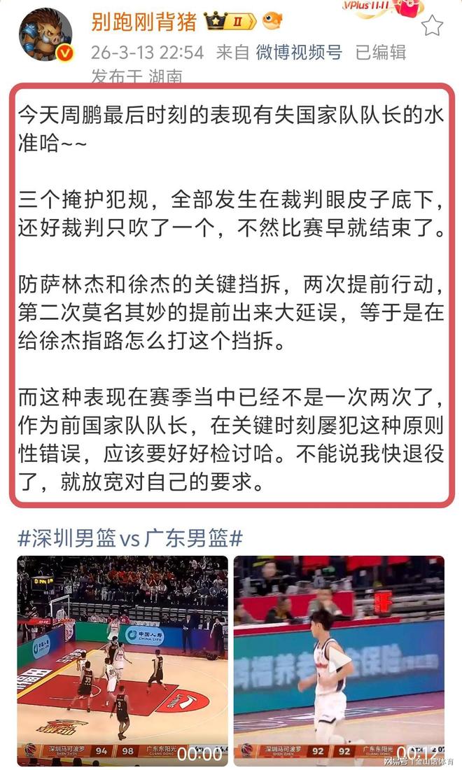 賽后,媒體人別跑剛背豬,在個人社媒發(fā)文痛斥周鵬的掩護動作,配文:今天周鵬最后時刻的表現(xiàn)有失國家隊隊長的水準(zhǔn)哈~~三個掩護犯規(guī),全部發(fā)生在裁判眼皮子底下,還好裁判只吹了一個,不然比賽早就結(jié)束了。防薩林杰和徐杰的關(guān)鍵擋拆,兩次提前行動,第二次莫名其妙的提前出來大延誤,等于是在給徐杰指路怎么打這個擋拆。而這種表現(xiàn)在賽季當(dāng)中已經(jīng)不是一次兩次了,作為前國家隊隊長,在關(guān)鍵時刻屢犯這種原則性錯誤,應(yīng)該要好好檢討哈。不能說我快退役了,就放寬對自己的要求。