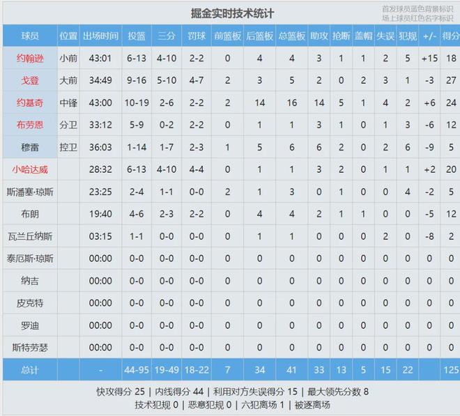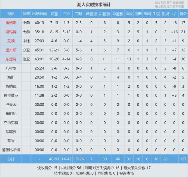 本賽季湖人和掘金交手3次,湖人2勝1負(fù)。最后看看數(shù)據(jù):