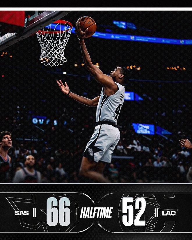 馬刺隊(duì)的文班亞馬上半場(chǎng)得到13分和8個(gè)籃板,卡斯?fàn)柕玫?2分、4個(gè)籃板和5次助攻,??怂沟玫?分和5次助攻;快船隊(duì)的加蘭得到12分和4次助攻,馬瑟林得到10分。