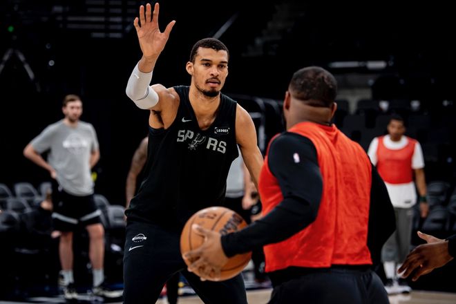 馬刺隊(duì)首發(fā)陣容:福克斯、卡斯?fàn)枴⑼呷麪?、尚帕尼、文班亞馬