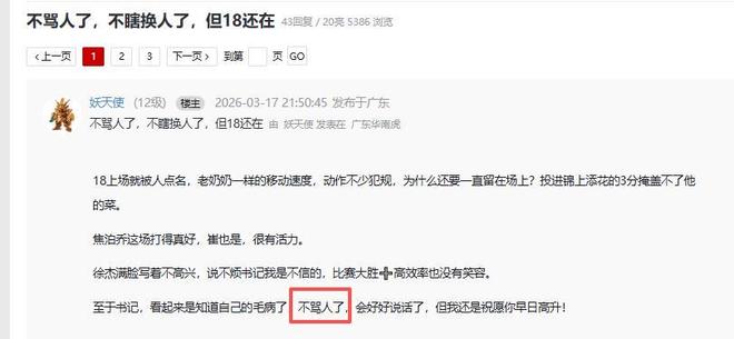 賽后球迷也說到杜鋒的轉(zhuǎn)變,用四個(gè)字大夸杜鋒,他們說杜鋒終于難得地“不罵人了”,“至于書記,看起來是知道自己的毛病了,不罵人了,會(huì)好好說話了,但我還是祝愿你早日高升!”不罵隊(duì)員,思想沒有壓力,這就是昨晚發(fā)揮得好的一個(gè)原因。希望杜鋒不只是一場(chǎng)不罵人,而是以后再也不罵了。對(duì)此,大家有怎樣的評(píng)價(jià)?