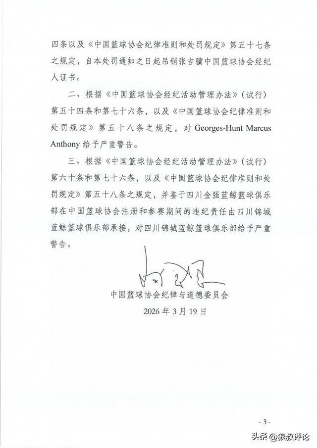 北京時間3月19日,四川男籃前外援亨特指控中方經(jīng)紀(jì)人張吉驥偽造陰陽合同一事,中國籃協(xié)紀(jì)律與道德委員會公布處罰結(jié)果,張吉驥吊銷經(jīng)紀(jì)人證書,對亨特和四川男籃嚴(yán)重警告。