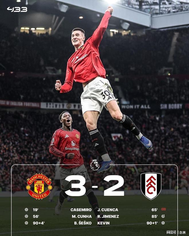 英超第24輪,曼聯(lián)主場3-2絕殺富勒姆,三連勝升第4。庫尼亞造點被改判,B費助攻卡塞米羅頭球破門首開紀錄,卡塞米羅助攻庫尼亞抽射擴大比分,謝什科替補中柱,馬奎爾送點,希門尼斯點射扳回一城,凱文世界波扳平比分,B費助攻謝什科抽射完成絕殺。