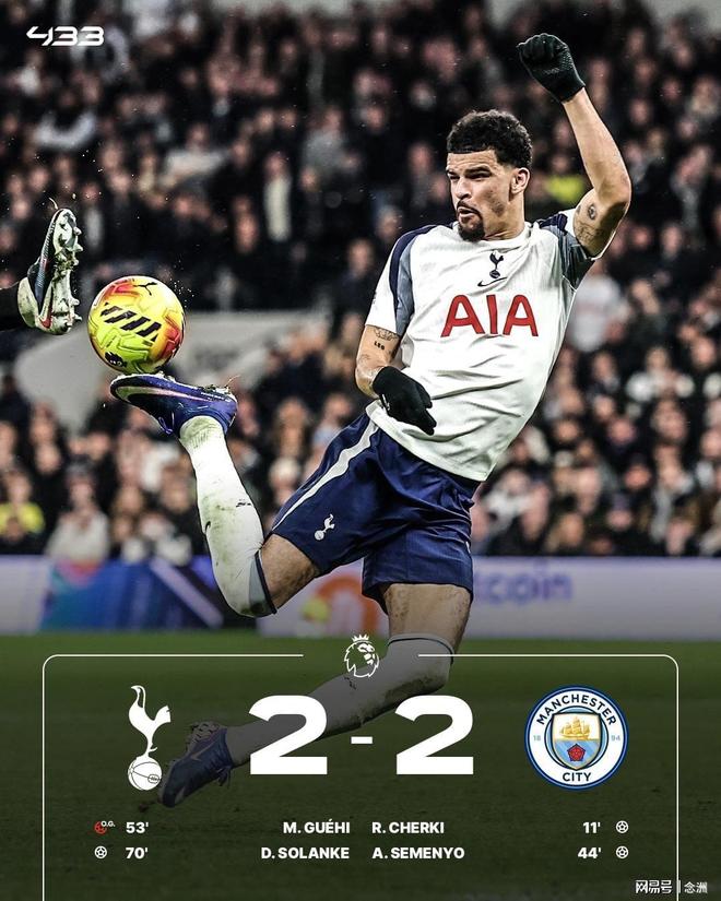 曼城客場2-2戰(zhàn)平熱刺,6輪僅1勝積47分位居第2,距榜首阿森納6分。熱刺聯(lián)賽6輪不勝,積29分名列第14。謝爾基首開紀錄,塞梅尼奧擴大比分,哈蘭德和B席助攻,索蘭克雙響+蝎子擺尾扳平。