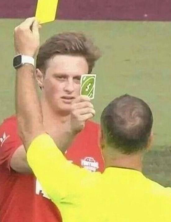 這張梗圖的來(lái)源是2023年的一場(chǎng)明星網(wǎng)紅慈善賽,知名網(wǎng)紅Max Fosh因被抓到犯規(guī),讓前英超裁判克拉滕伯格亮出一張黃牌警告,但Fosh出示了綠色反轉(zhuǎn)卡,引得現(xiàn)場(chǎng)大笑。