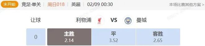 這場比賽最早開出來的時候是曼城讓一檔,不過隨著兩隊近期成績的變化,已經(jīng)調(diào)整成了利物浦讓一檔,強弱定位已經(jīng)發(fā)生了轉(zhuǎn)換,作為單關(guān)主任開得也很謹慎,2.14 3.52 2.65,兩隊本賽季首次交鋒,利物浦在客場0比3慘敗,當時曼城作為主隊主勝也只開出1.72,數(shù)據(jù)上差得非常大,利物浦方向的門檻非常高,勸阻意味很明顯,對于正在起勢的豪門球隊,不應(yīng)太過低估。