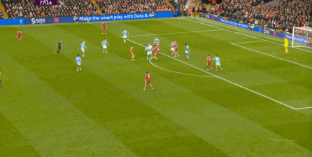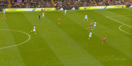 這在戰(zhàn)術(shù)上不會有特別明顯的變化,所以曼城的表現(xiàn)并未立刻改善,于是在第73分鐘,利物浦在由左至右的轉(zhuǎn)移過程中打出進(jìn)攻,隨后在二點爭奪中制造了定位球:
