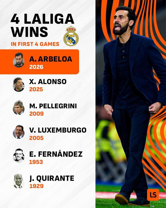 在帶隊客場擊敗瓦倫西亞后,阿韋洛亞成為皇馬隊史第六位執(zhí)教球隊前四場西甲比賽全部取得勝利的主帥,而他的前任哈維-阿隆索也做到了這一點。