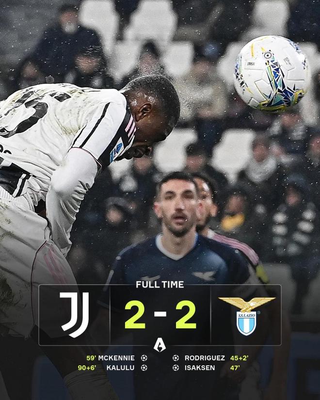 拉齊奧一度2-0領(lǐng)先,尤文在絕境中由麥肯尼和卡盧盧連追兩球,補(bǔ)時(shí)完成2-2絕平。