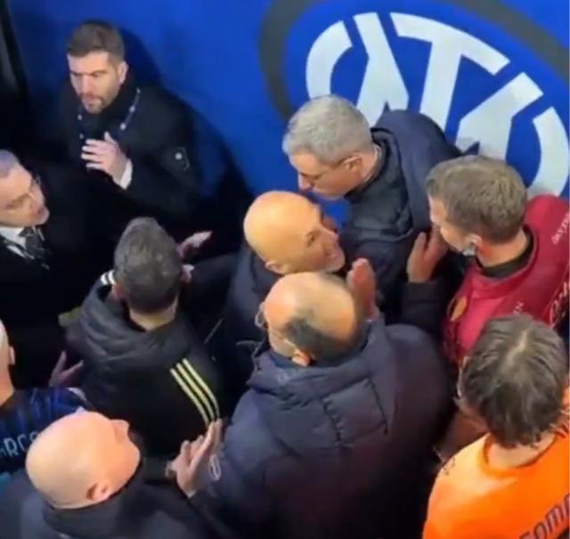 這段視頻其實(shí)拍攝于上半場(chǎng)結(jié)束時(shí),起因是卡盧盧被裁判出示了第二張黃牌從而被罰下,這一爭(zhēng)議判罰直接導(dǎo)致了“三巨頭”在球員通道內(nèi)的爆發(fā)。根據(jù)媒體的透露,當(dāng)時(shí)斯帕萊蒂喊的是:“比賽被毀掉了,比賽被毀掉了?!倍釀t反復(fù)強(qiáng)調(diào):“紅牌不存在!紅牌不存在!”