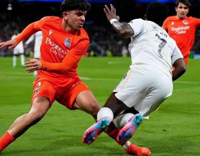 其實皇馬對陣皇家社會是有壓力的,貝林厄姆、姆巴佩都遇到傷病麻煩。但本場比賽皇馬在開場5分鐘就收獲了進球,阿諾德助攻貢薩洛打破僵局,不過好景不長赫伊森送點,奧亞薩瓦爾點射扳平。僅僅過了4分鐘,維尼修斯突破被阿蘭布魯絆倒,裁判判罰了點球,維尼修斯用點射破門還以顏色,皇馬2-1再次取得了領先。6分鐘后,皇馬又迎來了進球時刻,巴爾韋德兜射破門,皇馬上半場把比分改寫3-1。