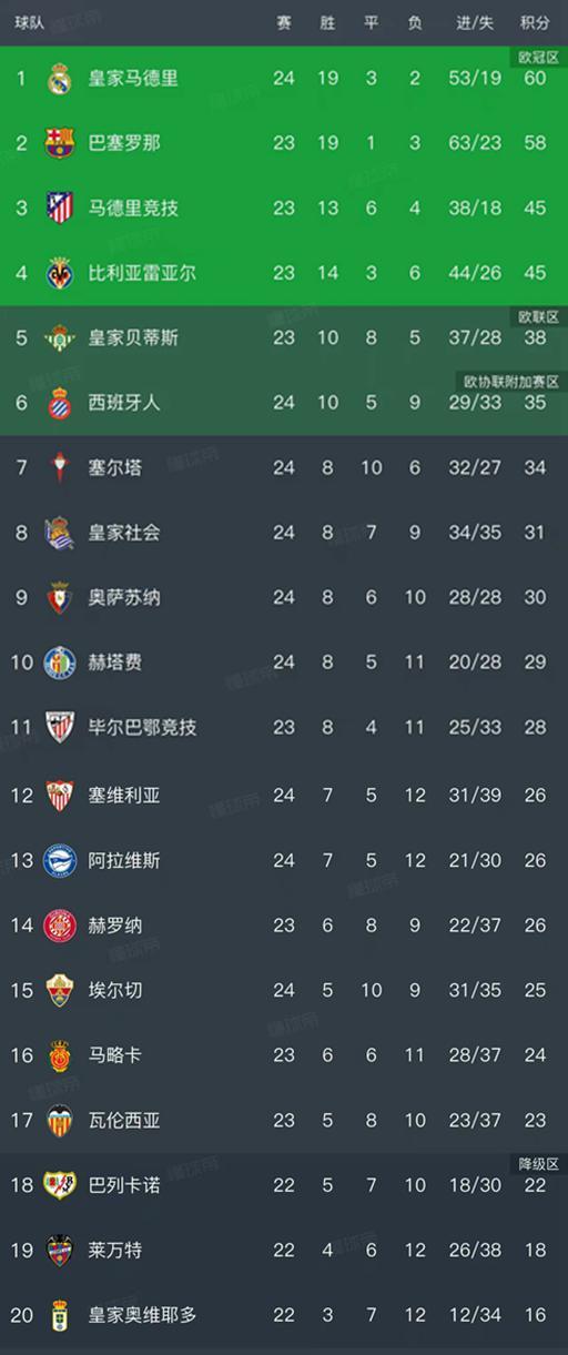 比利亞雷亞爾在客場1-2爆冷不敵赫塔費,兩連勝被終結,積分停留在45分還是暫列第4名,赫塔費以29分暫列第10名。奧薩蘇納客場0-0和埃爾奇悶平以30分暫列第9名。西班牙人陷入了不勝的怪圈,主場2-2戰(zhàn)平塞爾塔連續(xù)7輪不勝,進入2026年還沒有拿到任何的勝利,以35分暫列第6名。塞維利亞1-1戰(zhàn)平阿拉維斯,雙方的積分都是26分暫列第12和第13。