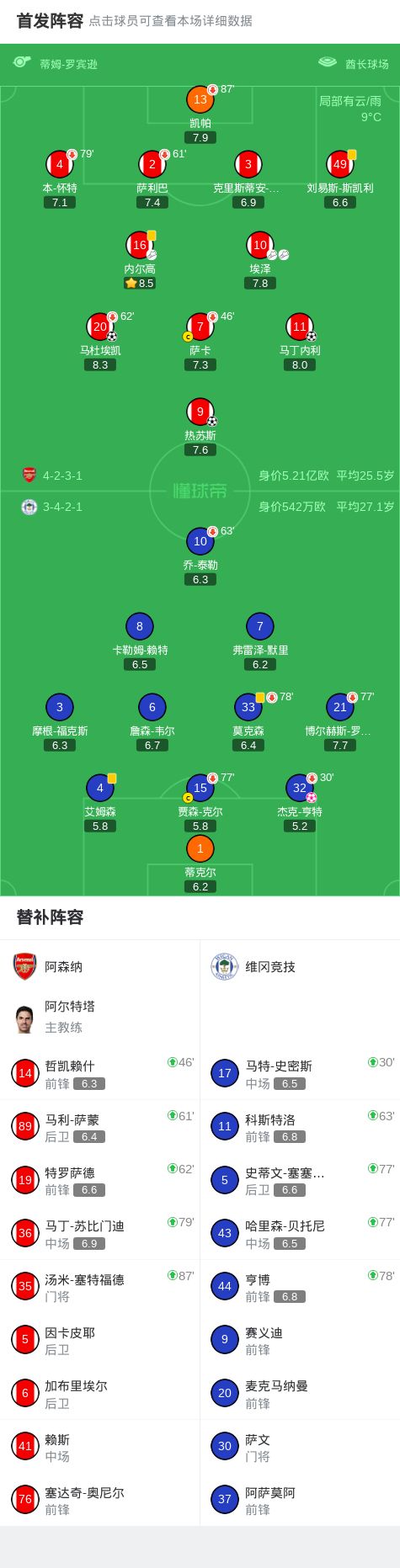 第46分鐘,哲凱賴什中場(chǎng)登場(chǎng),薩卡被換下