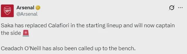 阿森納官推確認(rèn),薩卡取代卡拉菲奧里進(jìn)入了首發(fā)陣容,并且擔(dān)任隊(duì)長(zhǎng),小將奧尼爾進(jìn)入了替補(bǔ)席。