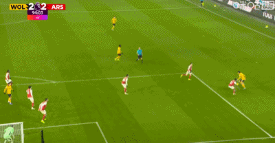 第90+3分鐘,加布里埃爾和拉亞配合失誤,卡拉菲奧里烏龍,狼隊(duì)2-2阿森納