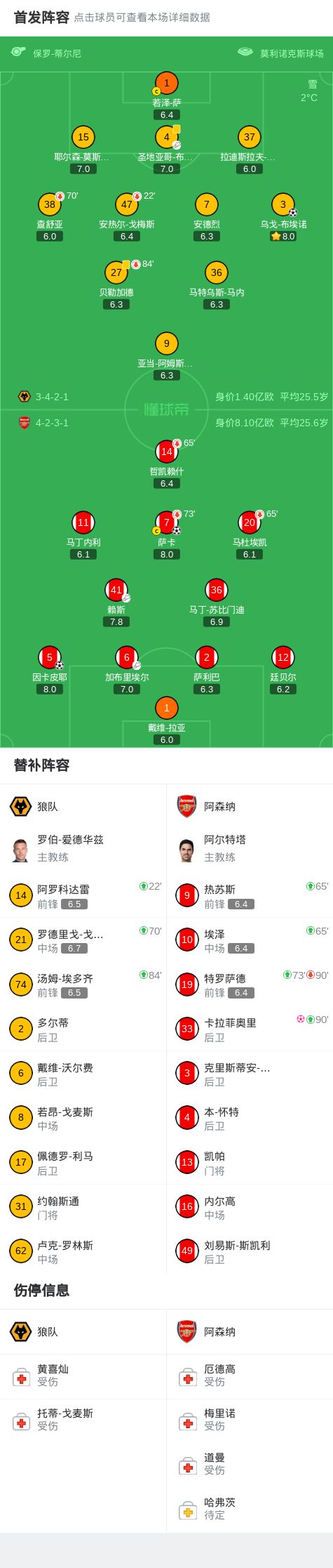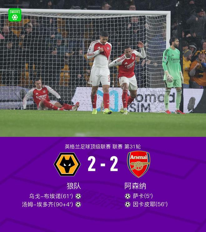 北京時(shí)間2月19日英格蘭足球頂級(jí)聯(lián)賽第31輪,狼隊(duì)主場(chǎng)對(duì)陣阿森納。上半場(chǎng)薩卡閃擊,馬丁內(nèi)利造險(xiǎn),下半場(chǎng)因卡皮耶?dāng)U大比分,布埃諾扳回一球,卡拉菲奧里烏龍。最終比分狼隊(duì) 2-2 阿森納。