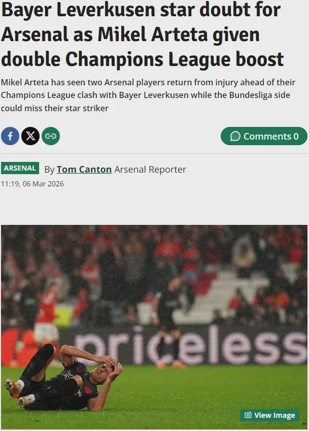 倫敦足球消息,阿森納在對勒沃庫森的兩回合歐冠淘汰賽前收獲了利好,對方前鋒??擞锌赡軙标噷屖值年P(guān)鍵戰(zhàn)。