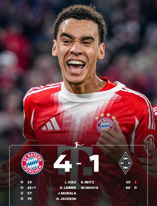 最終,拜仁4-1輕松取勝,不僅完成對(duì)門(mén)興的賽季雙殺,還豪取各項(xiàng)賽事6連勝。在積分榜上,南大王的領(lǐng)先優(yōu)勢(shì)已經(jīng)擴(kuò)大到14分,德甲冠軍幾乎沒(méi)有懸念。