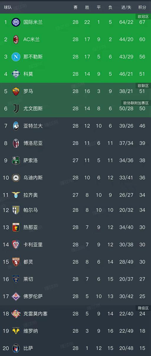 意甲最新積分榜