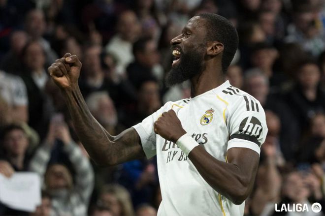 第39分鐘,皇馬獲得任意球,維尼修斯一撥,巴爾韋德標(biāo)志性起腳怒射,門將將球撲出,皮球來到呂迪格身前,德國后衛(wèi)不停球撩射,打破僵局。