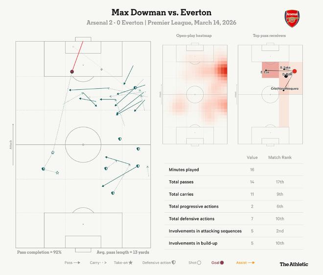 這項數(shù)據(jù)衡量了道曼在這場急需創(chuàng)造性火花的比賽中的影響力,也證明了阿森納球員們——這是最大的認可——在每一個機會都將球交給他(他在23分鐘內(nèi)接到了17次傳球)。