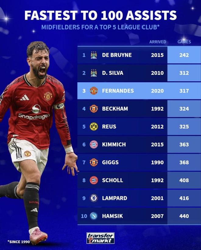 3月1日,曼聯(lián)在英超主場(chǎng)2比1逆轉(zhuǎn)水晶宮,費(fèi)爾南德斯先是點(diǎn)球扳平,隨后又送出任意球助攻,直接參與了球隊(duì)的兩粒進(jìn)球。這場(chǎng)比賽打完,他也正式把自己在曼聯(lián)的助攻數(shù)刷到了100次,而且只用了317場(chǎng)。最新這場(chǎng)球剛把他的組織價(jià)值又頂出來(lái),轉(zhuǎn)頭再看這份“五大聯(lián)賽俱樂(lè)部中場(chǎng)最快100助攻榜”,第三的位置就更有看頭了:前面是德布勞內(nèi)和席爾瓦,后面跟著貝克漢姆、羅伊斯、基米希這些名字,B費(fèi)能擠進(jìn)這一檔,已經(jīng)不只是數(shù)據(jù)好看那么簡(jiǎn)單。