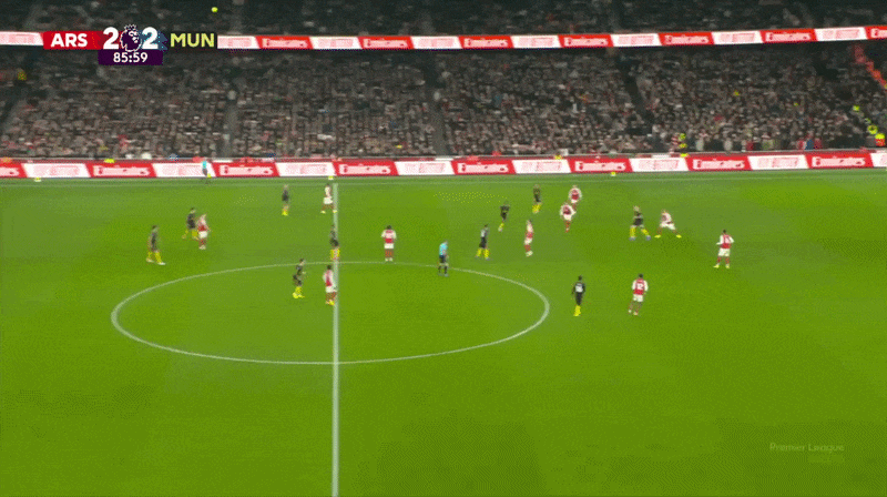 另一個(gè)例子來自接下來一周3比2戰(zhàn)勝阿森納的比賽,曼聯(lián)門將拉門斯大腳長傳找謝什科,梅努和費(fèi)爾南德斯處于爭奪第二點(diǎn)的理想位置。