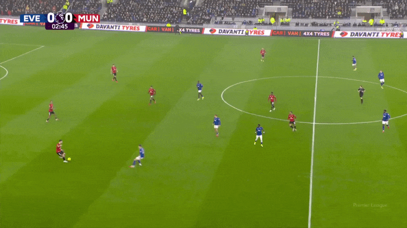 曼聯(lián)前場四人組的自由度幫助球隊(duì)將球推進(jìn)到前場,如下面二月的1比0戰(zhàn)勝埃弗頓的例子所示。