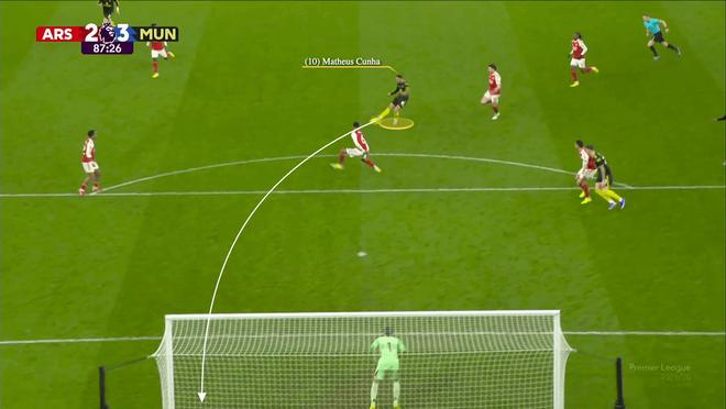 布魯諾-費(fèi)爾南德斯控制住球后,庫尼亞沖向場內(nèi),插入阿森納中場與防線之間的空當(dāng)。本-懷特最初在盯防庫尼亞,但費(fèi)爾南德斯將球傳給梅努后的跑動,讓阿森納右后衛(wèi)陷入了1對2的局面。