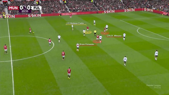 此處,庫尼亞向內(nèi)切,費(fèi)爾南德斯向邊線移動,曼聯(lián)從右路進(jìn)攻。隨后阿馬德重新組織攻勢,暫時(shí)扮演起“10號位”(中路組織者)的角色,將姆伯莫換位到左側(cè)。