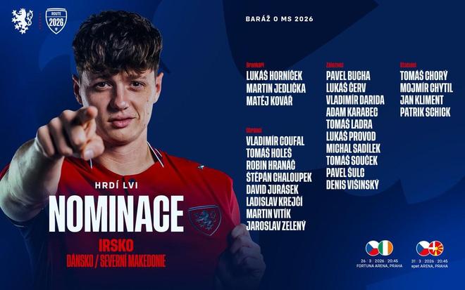 3月17日,捷克隊公布3月最新大名單,他們將在世界杯歐洲區(qū)預(yù)選賽附加賽對陣愛爾蘭,如果順利晉級,則將對陣丹麥與北馬其頓之間的勝者。